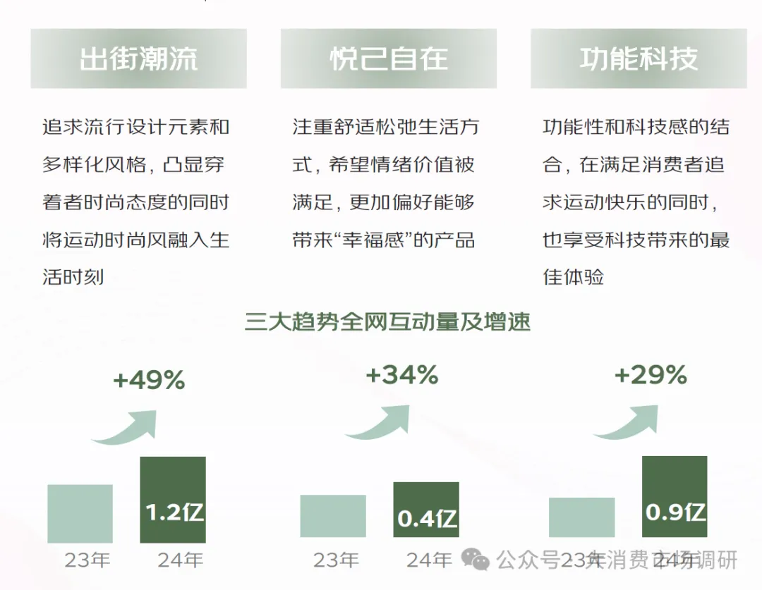 健身服相关讨论持续增长,表现出多元化、场景化发展趋势。用户个性表达、供给持续丰富、消费结构升级呈现出街潮流、悦己自在、功能科技三大主要趋势。