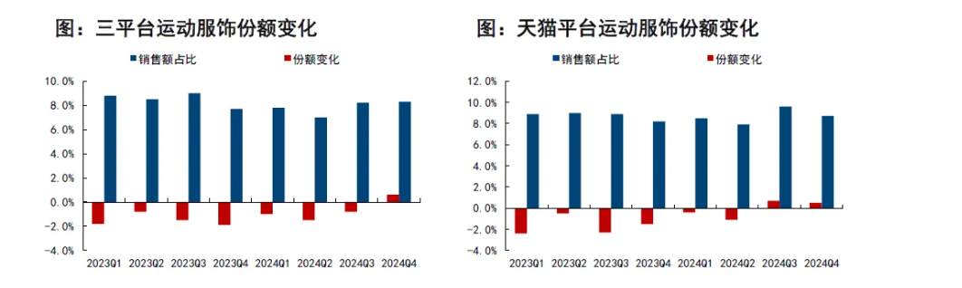 ①运动服饰2024Q4销售额占比8.7%,同比变动+0.5个百分点;