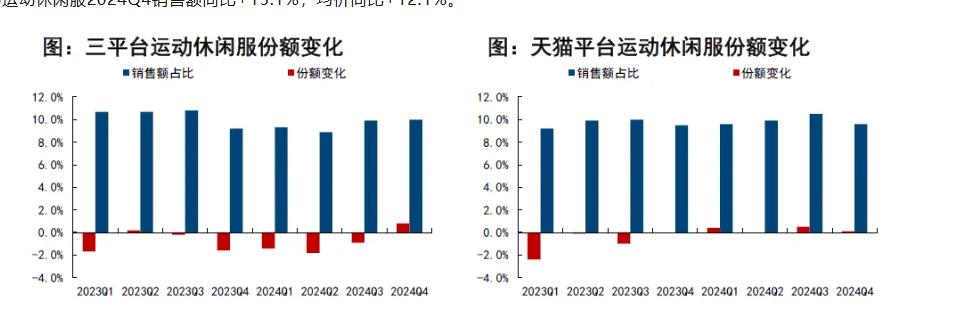 ①运动休闲服2024Q4销售额占比10%,同比变动+0.8个百分点;