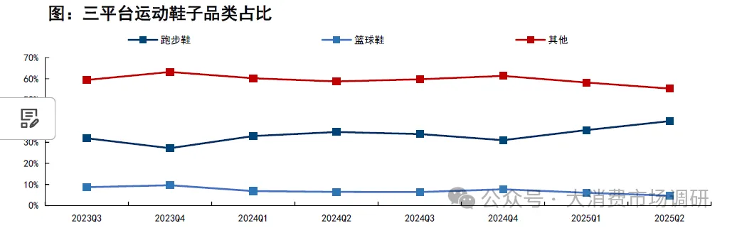 ① 跑步鞋2025Q2销售额占比40%,同比变动+5.1个百分点;