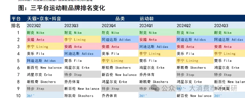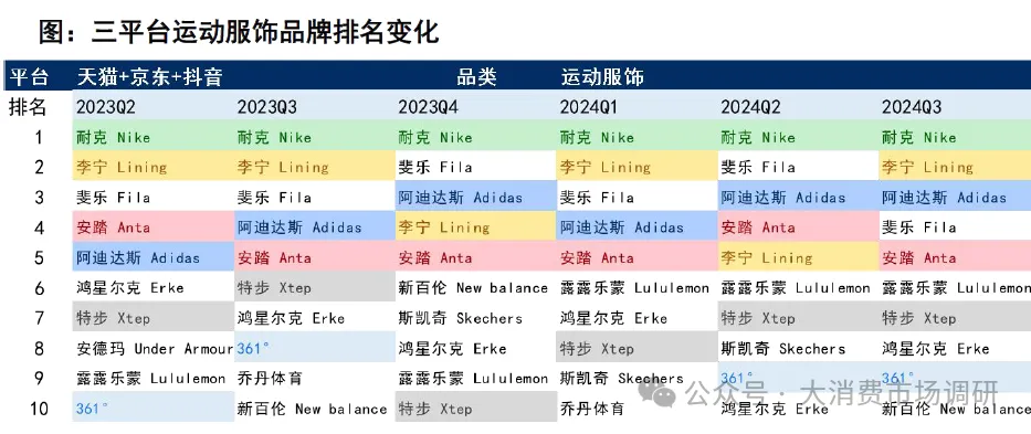 • 耐克持续领跑运动服饰榜单,FILA超越阿迪达斯重返第2,李宁、安踏等国产品牌保持稳定,斯凯奇取代乔丹体育进入前10。