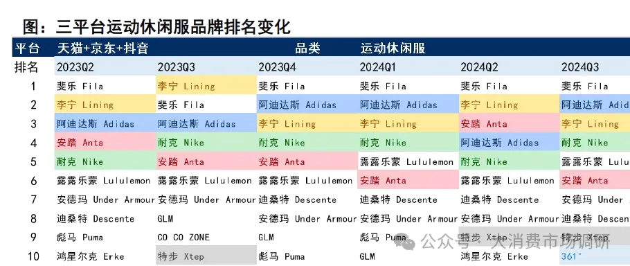 运动休闲服榜单中FILA占据榜首,Lululemon排名上升明显,耐克回落,李宁、安踏等本土品牌排名相对稳定。