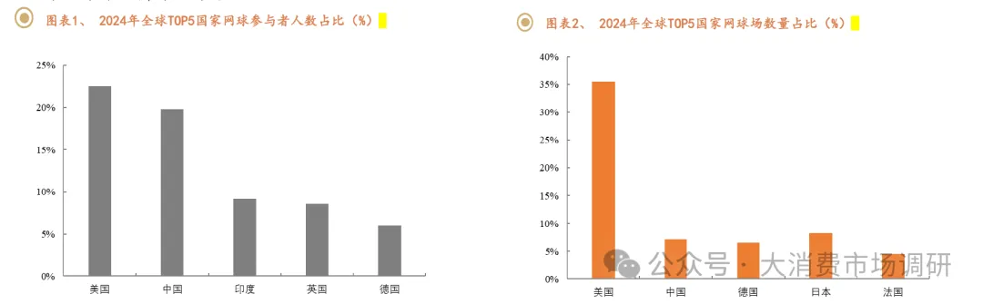 KANTAR 《 从 小众运动 到 全民热潮 解码网球人群与市场机遇 》 2024 年全球网球参与者 TOP 5 国家依次为美国 22 5 、 中国 19 8 、