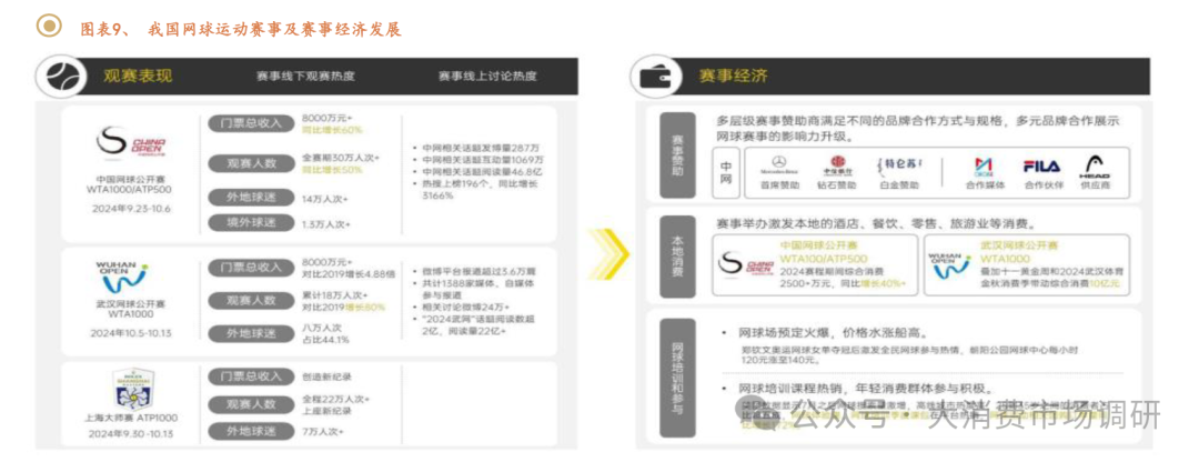 我国网球赛事热情延伸消费热情 激活我国网球市场经济发展 。 我国主要的三大网球赛事为:中国网球公开赛 WTA/ATP 、 武汉网球公开赛 ( 、 上海大师赛 ATP 。 根据 2024 年三大网球赛事的参与热度及赛事经济情况来看 赛事线下关注热度较高 赛事线上讨论热度增幅快 。 此外 2024 年我国网球场预定火爆 且网球培训课程热销 年轻消费群体参与积极 。