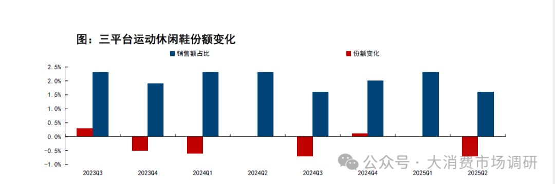 ① 运动休闲鞋2025Q2销售额占比1.6%,同比变动-0.7个百分点;