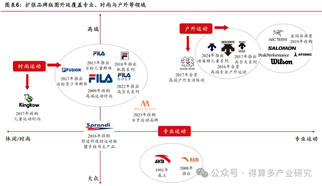 多品牌方面,公司目前已构建了从大众到高端、从时尚到专业的多品牌矩阵。旗下品牌主要包括大众专业运动品牌安踏、高端时尚运动品牌FILA、高端专业户外运动品牌迪桑特、高端户外生活休闲品牌可隆等,以及亚玛芬体育旗下的始祖鸟、萨洛蒙等。