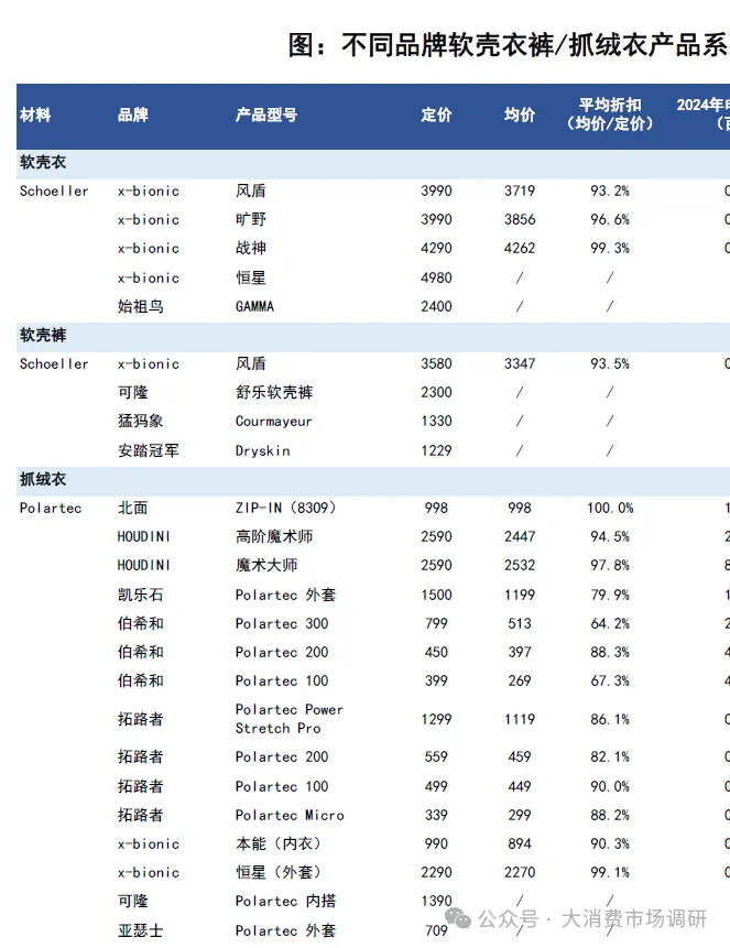 Polartec面料在抓绒衣上的应用较为普遍,根据不同品牌定位、以及产品形态(外套/内搭)、厚度(300/200/100),定价差异相对较大。2000+的品牌主要有HOUDINI、x-bionic;1000+的品牌有可隆、凯乐石、拓路者Polartec PowerStretch Pro系列;伯希和、拓路者大部分Polartec产品均价在500以内。从销量来看,2024年伯希和及HOUDINI销量最高,相关系列合计均超过10万的销量。