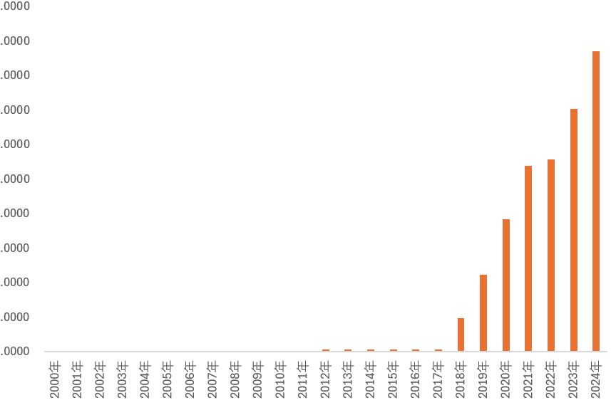 全球各国光伏发电:2000-2024年阿根廷历年光伏发电装机容量规模走势