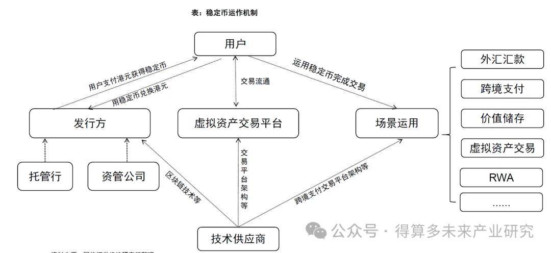 稳定币运作机制主要包括:一级市场发行、二级市场流通和场景运用。