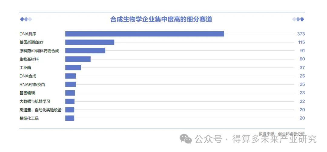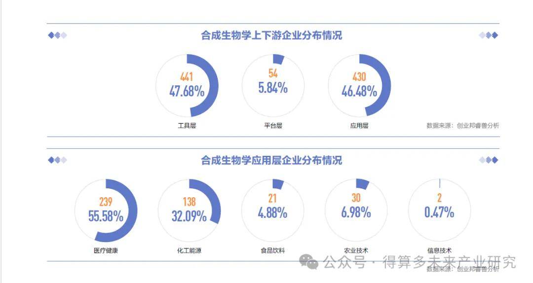 现有企业主要集中在工具层的DNA测序,应用层的医疗健康、化工能源领域。据睿兽平台不完全统计,目前中国广义的合成生物学关联企业现有925家,其中工具层企业441家(占47.68%),平台层企业54家(占5.84%),应用层430家(占46.48%),呈现两端大中间小的格局。工具层中,以DNA测序(373家)、DNA合成(25家)、基因编辑(23家)企业为主,其中DNA测序企业发展较成熟(占84.58%),DNA元件库、模式生物库方面企业分布较少、起步晚,后续发展空间较大。平台层中,以大数据与机器学习(22家)、高通量自动化实验设备(20家)企业为主。应用层中,医疗健康(239家)、化工能源(138家)企业最多,信息技术领域企业最少,农业技术、食品饮料领域发展潜力较大,二级赛道中基因/细胞治疗、原料药/中间体药物合成、生物基材料企业分布较为集中,也是近年的投资热点。