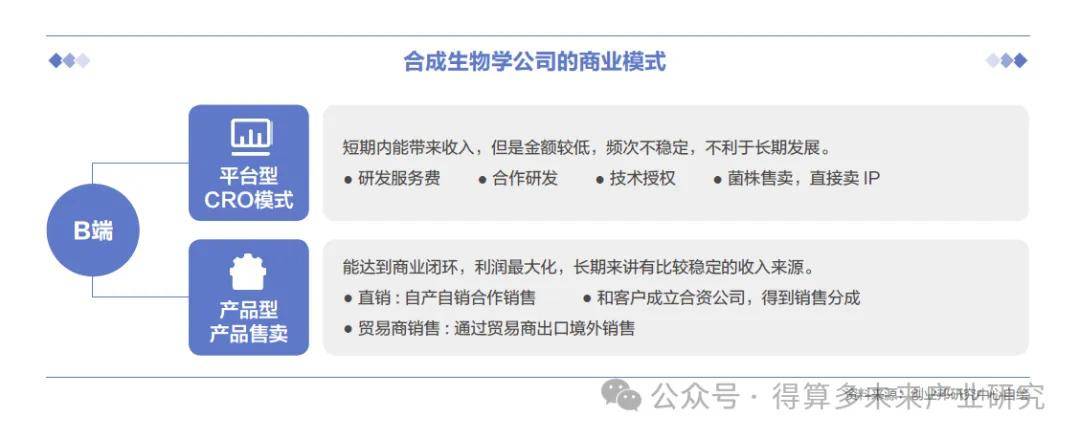 排除工具层企业,在商业模式上,合成生物学企业主要分为平台型和产品型。研发平台型公司数量较少,早期为客户提供CRO等服务,在业务规模变大、融到一定资金的时候,会转变为建厂自己生产原料。大约88%合成生物学公司都是产品型公司,以生产产品为主要目标,构建实验室小试—中试—量产放大阶段,形成完整的商业化闭环。部分原因是,中国尚处行业发展早期,需要产品产生持续的现金流,此外我国在发酵生产领域拥有天然优势,企业可以高效低成本进行化工及医药产物的提纯开发及规模化放大。产品管线呈现多样性,大部分公司采取多管线并行的策略,横跨不同行业的多品类布局。未来,平台型公司与全产业链型公司可以互相转化,平台型公司同样可能孵化或生产产品,全产业链公司打通某一代谢通路后可成为平台公司。