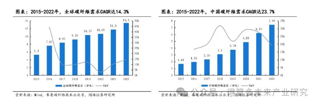 根据赛奥碳纤维和Wind数据推算,2015-2022年全球碳纤维需求年均复合增速达14.3%,中国碳纤维需求年均复合增速达23.7%。