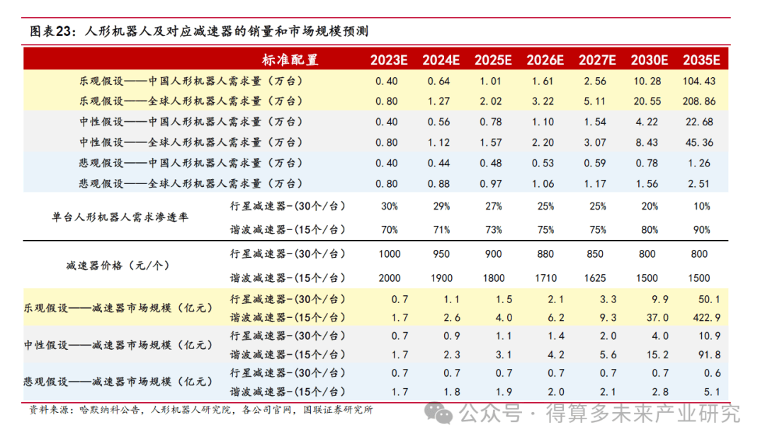 乐观假设下,2035 年全球人形机器人销量达到200 万台,人形机器人对精密行星减速器、谐波减速器市场规模拉动分别为50、423 亿元;