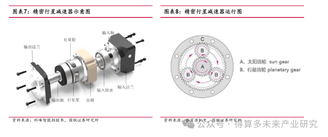 (2) 傅利叶智能-Fourier GR1: 选择自研一体化执行器(减速器选用行星减速器),单个灵巧手带有6 个自由度,腿部和手臂分别有超过5 个自由度,整体大约需要32 个行星减速器;