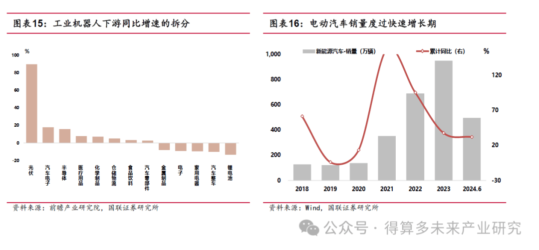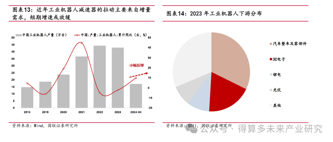 工业机器人增速整体趋于平稳,2021-2022 年较大上行周期后,增量对减速器需求的拉动有限。近年国内相对较成熟的工业机器人已经度过快速成长期,逐步具有周期性。上一轮周期增速顶点为2021 年,国内工业机器人产量达到36.6 万台,同比增速高达44.9%;当前2024 年前4 个月工业机器人产量达到17.1 万台,增速高达9.9%。当前处于小型上行期,后续增长峰值或低于前波峰。GGII 数据显示,2023 年汽车整车及零部件、3C 电子、锂电、光伏行业机器人销量占比分别为32.17%、18.79%、9.36%、8.40%,以上领域合计占据近70%工业机器人下游的应用份额。