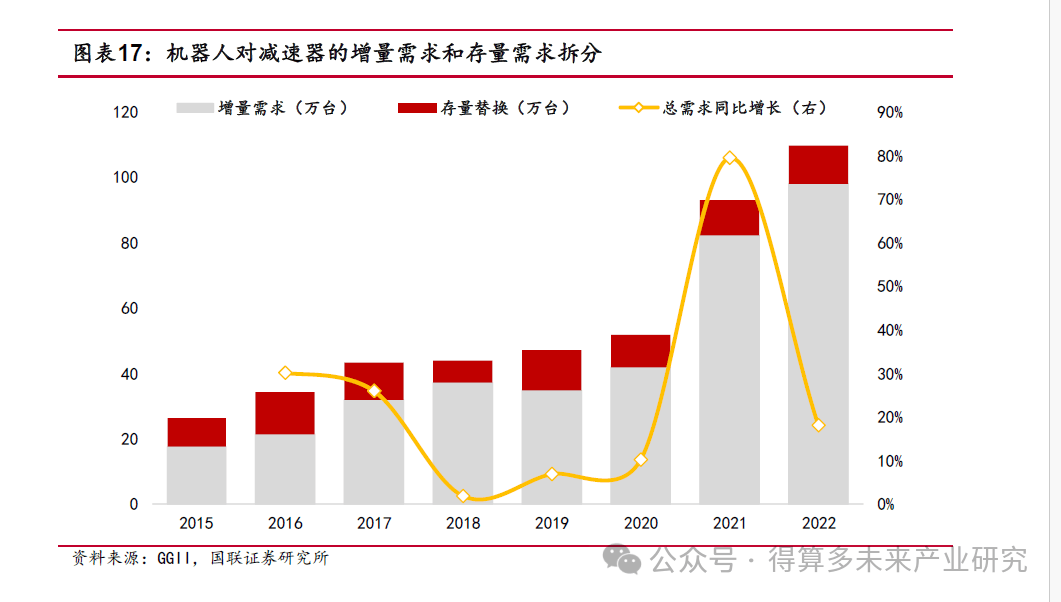 后续存量替换对减速器需求拉动或将明显。综合来看,工业机器人的替换需求在2015 年达到8.9 万台,2022 年为11.85 万台,存量替换需求占总需求的比重从37.96%降至10.78%的历史较低水平。主要系2021-2022 年工业机器人出货量受下游新兴产业拉动快速增长,增量需求增长明显,存量替换未明显增长。后续两年,前期新增的机器人刚好到了减速器更换周期节点,工业机器人减速器的存量替换或可能成为新的助力。