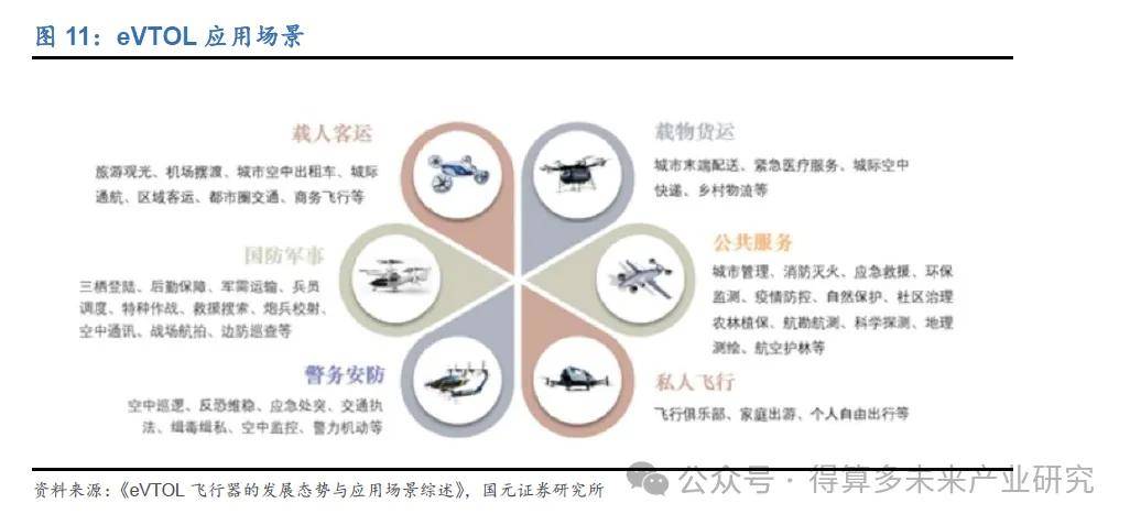 eVTOL适用范围广,应用场景丰富。目前eVTOL可以满足少量乘客的城市飞行或包裹递送,小型eVTOL在军事、航模、农业、安防等领域已有大量应用。随着全球eVTOL量产,应用场景将大幅拓展至城市客运(UAM)、区域客运(RAM)、城市物流配送、商务出行、紧急医疗服务、私用飞行器等多种场景模式,大致可分为载人客运、载物货运、公共服务、警务安防、国防军事及私人飞行等六大类行业场景。