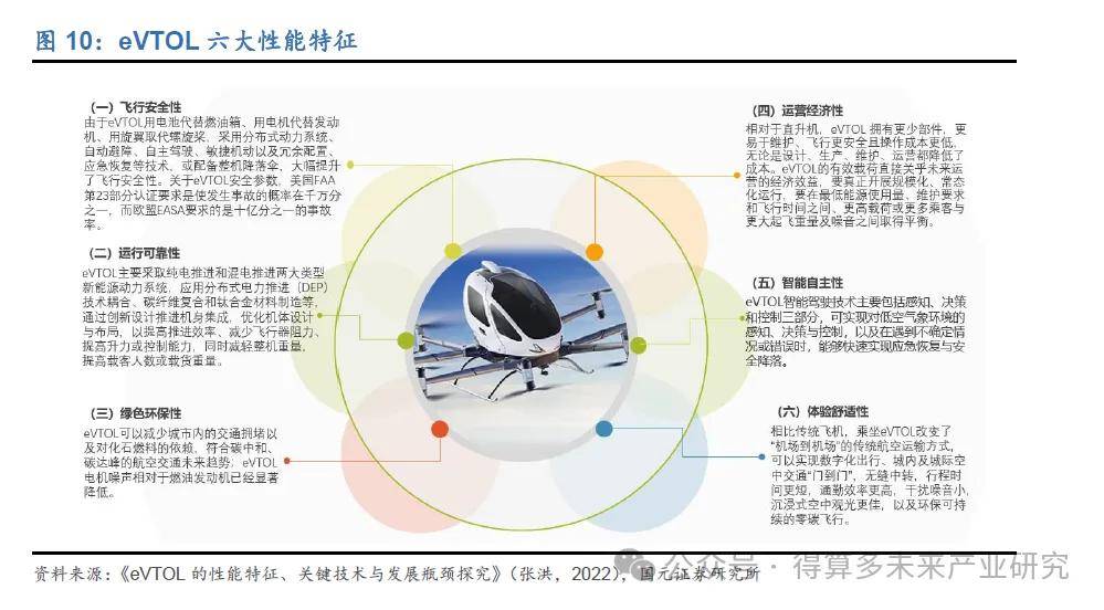 eVTOL性能优势明显,竞争能力突出,发展前景广阔。eVTOL主要具有六大性能特征:飞行安全性、运行可靠性、绿色环保性、运营经济性、智能自主性、体验舒适性。1)飞行安全性:eVTOL采用多电池系统、多电机驱动多旋翼,具有多套独立可靠的动力系统提供安全冗余,大幅提升飞行安全性。2)运行可靠性: eVTOL运营环境复杂,对运行可靠性要求更高;电气化的eVTOL简化了传统动力及传动复杂的机械结构,在各种功能上均实现了运行可靠性。3)绿色环保性:eVTOL基于电动化,没有发动机,符合零碳愿景和环保要求,同时能够大幅降低噪音,提升乘坐体验和舒适度。4)运营经济性:eVTOL在生产、设计、运营等方面均具有低成本优势,随着规模化和供应链不断成熟,未来eVTOL运营成本将进一步降低,更加大众化、普适化。(5)智能自主性: eVTOL拥有智能驾驶技术,帮助感知、决策、控制,实现高度自动化运行。(6)体验舒适性: eVTOL可实现城内及城际空中交通“门到门”无缝中转,缩短行程时间以提高通勤效率,同时具备噪音小,带来沉浸式观光体验。