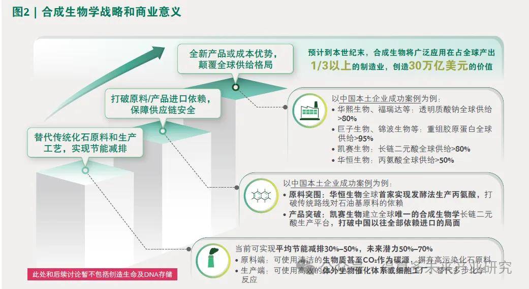 • 发展新阶段(2014年以后):工程化平台的建设和生物大数据的开源应用相结合,全面推动合成生物学技术创新以及相关应用的开发和商业化。部分代表性技术或应用里程碑包括人工密码子及非天然氨基酸系统的开发、计算/AI蛋白结构设计及预测、DNA存储、以二氧化碳为原料人工合成淀粉等。合成生命领域,提出最小基因组(“最简生命”)概念并在支原体、E.coli、酵母等不同人造生命体系上陆续实践,开发人造核糖体、线粒体、叶绿体等合成细胞器、开发人造胰岛β 细胞等,以及作为Sc2.0Project 的延续,对基因组和染色体的重构开始从仅序列层面向空间三维结构拓展。合成生物学具备三大至关重要的战略和商业意义(参阅图2):第一,替代传统化石原料和高污染的化工生产工艺,实现节能减排、满足环保要求;第二,以属地常见生物质废料甚至二氧化碳为碳源开发全新合成路线,打破原料及产品的进口依赖,保障供应链安全;