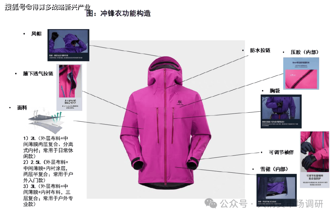 • 冲锋衣核心功能体现主要在于面料系统,目前市面上国际龙头供应商(如GORE-TEX、Dermizax)垄断高端功能面料市场,GORE-TEX Pro授权仅限头部品牌,掌握防水透气先进技术,可以达到最佳指标,防水>28000mm,透气>25000g/m²/24h;除第三方面料公司外,专业户外品牌也有自研面料,例如如北面(DryVent)、哥伦比亚(Omni-Tech、OUTDRY EXTREME)、凯乐石(Filtertec)。