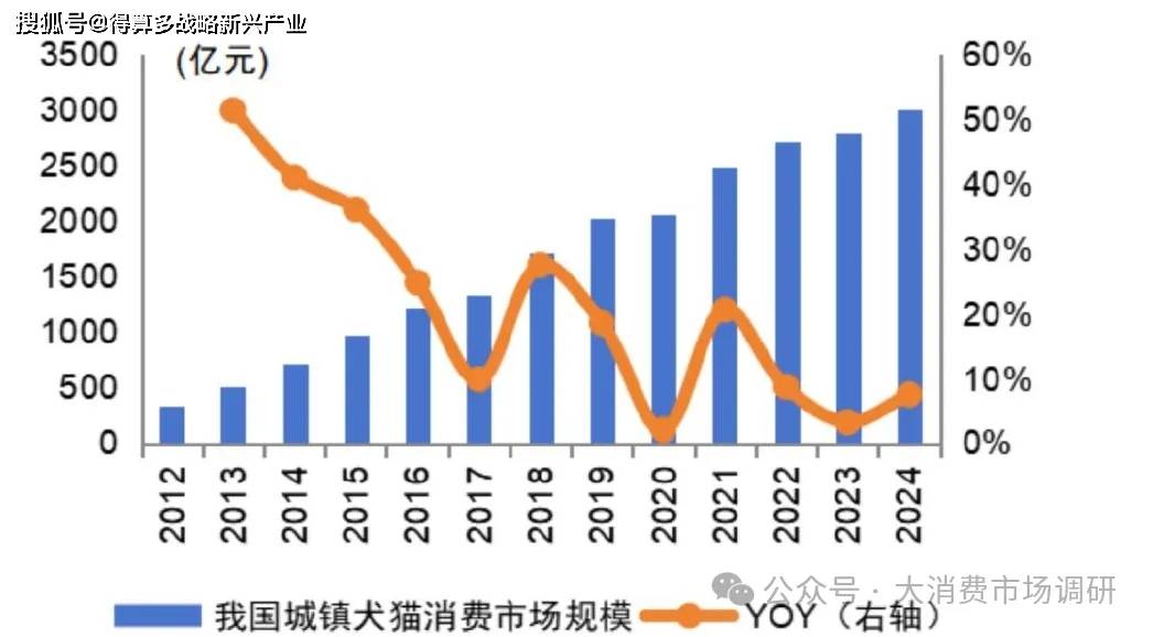 2024年我国城镇宠物(犬猫)消费市场规模达到3,002亿元,比2023年增长7.5%,规模持续稳定增长。2012-2024年复合增长率为20%。随着宠物家庭渗透率和行业成熟度的持续提升,我国宠物行业市场规模呈现稳步上升的态势。