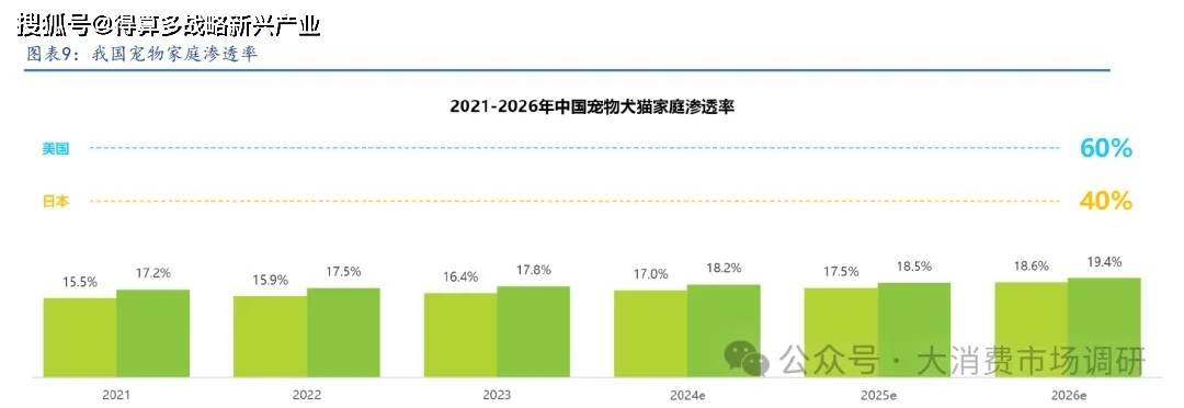 根据相关数据进行测算,2023年国内宠物犬家庭渗透率约为17.8%,预计2026年将达到19.4%; 2023年国内宠物猫家庭渗透率约为16.4%,预计2026年将达到18.6%。目前国内宠物渗透率与美国等成熟宠物市场相比,存在约3倍的差距;与泰国、日本等与国内思想理念和居住环境相近的国家相比,也存在2倍的差距。