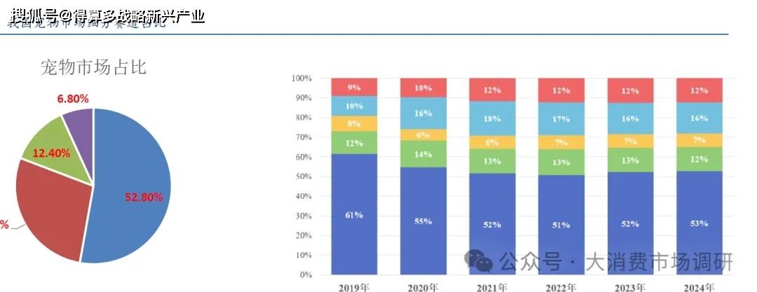 2024年宠物食品消费占我国城镇宠物总消费约 52.8%,宠物医疗市场份额为28%,市场规模约为800亿,宠物用品、宠物服务市场份额较低,分别为12.4%和6.8%。