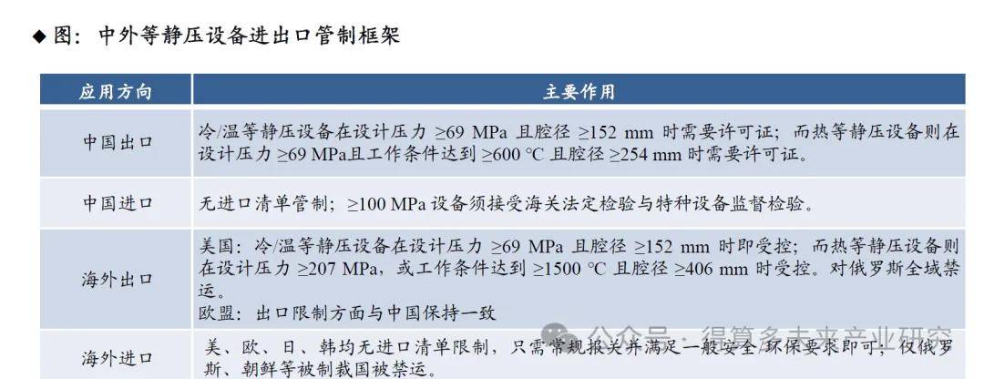 等静压设备进出口因瓦森纳协议需申请商务部许可,但对固态电池用用途不构成实质限制。中欧美对等静压设备的进口均无管制;出口限制基本一致,基本遵循国际瓦森纳协议,禁止设备用于军工用途。冷、温等静压设备在设计压力>69MPa且腔径>152nm时需申领许可证;热等静压设备则在设计压力>207MPa,且工作条件达到>600C且腔径>254mm时触发管制。等静压设备出口管制主要针对军工用途,固态电池等一般用途申请许可证即可,不构成实质出口限制。