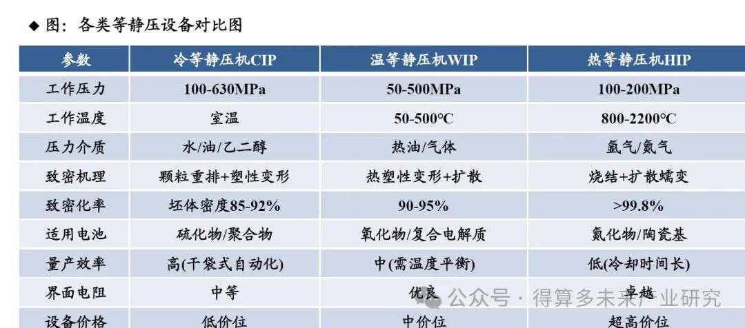 温等静压压力与温度区间契合固态电池致密化要求,是当前最优工艺路径。温等静压在中温条件下压制,可提升界面接触和致密度,又避免高温副反应。其温度区间与固态电解质稳定性契合,能在保持性能的同时改善界面质量。同时设备能耗和成本相对较低,具备产业化潜力,正成为电池厂商与设备商重点推进的工艺。冷等静压致密化程度有限,热等静压温度过高导致副作用突出。1)冷等静压:CIP工艺由于没有热作用,材料间的界面接触改善有限,难以直接实现高致密度,因此在固态电池电极和电解质成型中更多作为前处理手段。根据ACSEnergyLetters报道的实验结果,相比辊压约12%的电芯孔隙率,冷等静压可降低至约1.8%,而温等静压在材料高温软化的作用下,颗粒更易重排与压实,可将孔隙率进一步降低至约0.15%。2)热等静压:HHP在高温高压下能显著消除孔隙、提升密度和强度,常用于陶瓷和合金。但在固态电池中,温度过高会导致电极材料烧结、溶解,破坏整体结构稳定性。