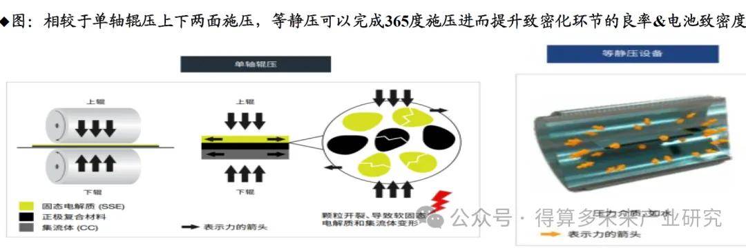 固-固界面致密化是全固态电池性能提升&量产的核心瓶颈。在生产过程中,正极、因态电解质与负极需堆叠形成稳定界面,但在循环过程中,固-固界面易出现接触劣化、孔隙残留与颗粒接触不足等问题,造成致密度下降,进而引发锂枝晶生成、抬高内阻、削弱离子传输效率,并加速性能衰减。为改善致密度,通常需施加超过10OMIPa高压压实材料。传统热压与辊压因压力方向单一且分布不均,易产生边缘效应和层间滑移,难以实现三维致密化与一致性,从而限制性能提升。