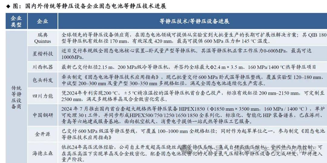 等静压&跨界玩家正加速布局等静压技术路线,聚焦固态电池关键成型环节。传统等静压设备厂商:依托超高压技术壁垒实现"能力复用",加速实现向固态电池场景技术转化和设备落地。1)海外玩家:瑞典Quinus技术积累深厚,率先推动冷等静压设备在固态电池中的产业化应用,并扩展至温等静压方案形成覆盖更广材料体系的产品组合。2)国内玩家:川西机器、钢研昊普与包头科发长期深耕热等静压领域,具备高温高压设备研制能力,正加快向固态电池场景的技术转化与设备落地。