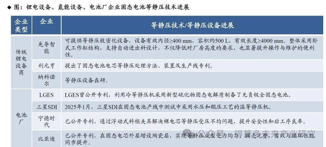 跨界玩家:电池厂+锂电设备厂商携下游产线经验反向定义设备,推动固体电池等静压设备产业化落地。1)锂电设备玩家:先导智能率先探索差异化路径,开创性推出卧式等静压设备,以期在装载效率、自动化集成等方面取得突破;利元亨则推出自动化立式等静压方案,通过自动上下料、在线检测等功能提升生产节拍与一致性。2)主流电池厂商:如宁德时代、比亚迪、L(GES、三星SDI等已陆续启动等静压路径的验证与导入,推动设备选型与工艺工程化进程加速。