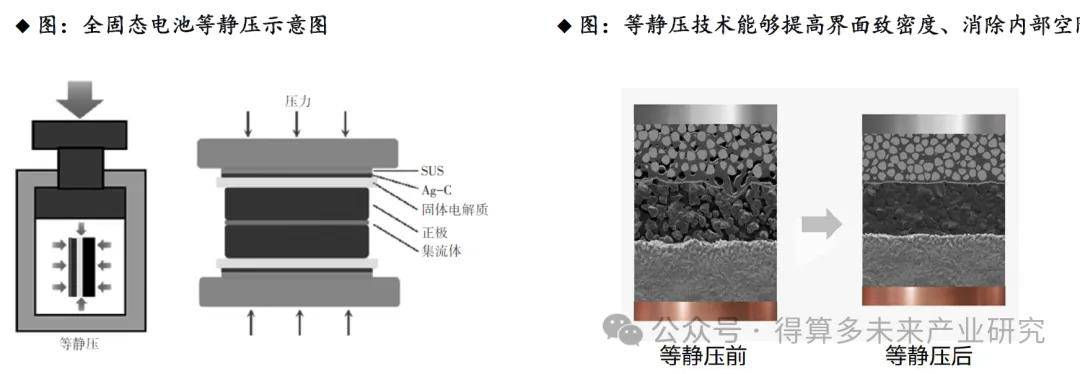 等静压技术用于改善全固态电池固固界面接触问题,拉动等静压机成为核心增量设备之一。等静压技术基于帕斯卡原理,能够提高界面致密度、消除内部空隙,改善组件接触效果,从而有效降低内阻、减少孔隙率、延长循环寿命并提升库仑效率。经过等静压处理,离子电导率可提升30%以上,内部电阻率降低20%以上,循环寿命提升约40%。这一显著优势正推动等静压机成为固态电池生产的核心增量设备。