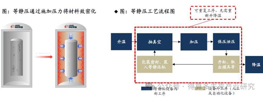 等静压工艺利用流体介质的不可压缩性与压力均匀传递特性,向被压材料均匀输送压力使其致密化。等静压将粉体材料、零部件或电芯装入高压容器,通过压力泵/压缩机注入气体、水或油等介质并加热,使腔体内各方向承受一致压力,从而使粉末或待压实的烧结坯料(或零件)致密化、形成高密度成型体。等静压工艺主要流程为包套密封、升温、抽真空、加压、保压、降压、降温等。工艺上,材料先包套密封,装入升温完成的设备后经抽真空,随后注入流体介质并加压,确保压力均匀传递并压实内部粉体。完成保压后依次卸压、取出,最终获得高致密度成型体,适用于电池与陶瓷等精密制造场景。设备在使用前和使用后需要经过升温和降温的流程,但在连续生产过程中无需每轮重新升降温。