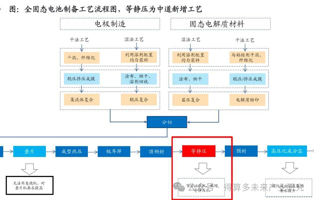 固态电池中道新增等静压工艺,主要用于叠片后的致密化环节。等静压工艺应用于电芯成型后,通过均匀多向压力实现致密化,消除固固界面空隙,提升电解质与电极接触质量,改善离子传导率和循环性能。这一工艺有效解决界面贴合难题,是实现电池高能量密度和高稳定性的核心环节。