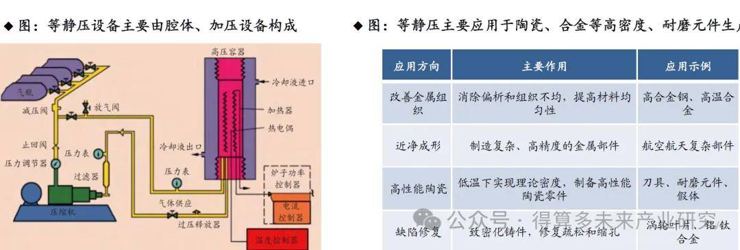 等静压技术历经七十年验证,早已成熟应用于多种工业场景。1955年Batelle研究所首创热等静压,随后冷、热、温三路线并行,装备从实验室扩展到直径2.4m的工业级,工艺标准完备,已成为航空航天、医疗、汽车、电子等高端制造领域不可或缺的关键技术之一,为固态电池制造奠定可直接套用的工业基础。等静压技术最初主要应用于金属与陶瓷领域,凭借其致密化与组织均匀化优势,在多个方面得到广泛使用。1改善金属组织:结合粉末冶金与热等静压工艺,有效消除偏析和组织不均,提升高合金钢及高温合金的性能;2近净成形:可直接制造航空航天发动机中的粉末高温合金涡轮盘、压气盘等复杂零部件,实现高强度与高精度兼备;3高性能陶瓷:在较低烧结温度下达到理论密度,用于切削刀具、耐磨元件及生物医学假体等;4缺陷修复:广泛用于铸件的致密化处理,消除内部疏松和缩孔,显著提高材料的可靠性与使用寿命。