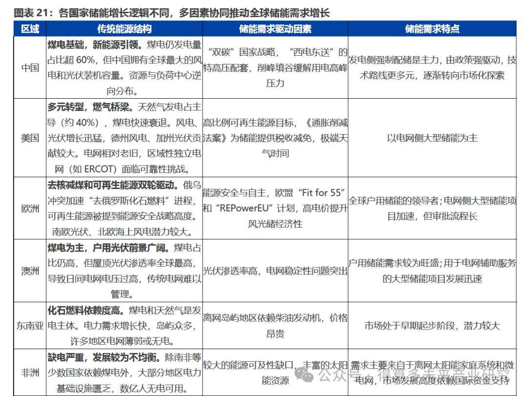 从各国能源结构转型的角度看,储能需求的增长是可再生能源渗透率提升、传统能源系统重构、区域能源安全博弈共同作用的结果。全球能源格局正经历一场由气候与能源政策、技术变革与地缘政治博弈共同驱动的深刻重构,其核心是主导能源从"资源禀赋型"的化石燃料向"技术驱动型"的光可再生能源转变。这一转型的广度与深度,直接决定了储能,尤其是与风光发电配套的储能系统,从"可选项"变为"必需品"的进程。然而,不同地区的资源禀赋、政策路径和电网现状差异较大,导致了其能源结构与储能需求驱动力呈现出鲜明的区域化特征。