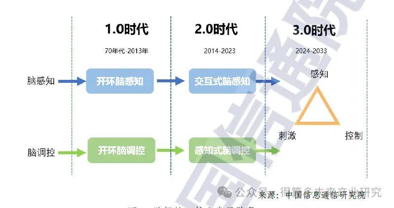 自2013年起,全球多国相继启动为期十年左右的脑科学研究,显著加速了脑机接口的技术革新与产业化进程。基于脑计划实施的时间节点与技术演进特征,可将脑机接口技术在横向上分为脑感知技术和脑调控技术两条演进路线,在纵向上分为三个时间阶段。1.0时代(2013年前)脑感知与脑调控技术各自独立发展,该阶段脑感知与脑调控技术以单向采集或刺激为主,缺乏双向交互能力与闭环能力。2.0时代(2014-2023年)脑感知交互性提升,脑调控走向闭环,在脑计划资源投入下,脑机接口技术呈现两大突破,一是脑感知技术交互化,多种开源工具、智能算法使复杂抽象的脑感知结果可理解性加强,输出更为实时准确,实现流畅的交互体验。二是脑调控技术感知化,即从开环刺激转向闭环调控,如脑起搏器可基于感知结果动态调整刺激参数。3.0时代(2024年起)感知、刺激、控制技术融合发展,随着多国的脑计划进入后半程,脑机接口技术向深度融合演进,不仅能精准感知大脑活动信号,还能依据这些信号对大脑状态进行调控,同时实现对外围设备的有效控制,为用户提供更自然、智能的交互体验。