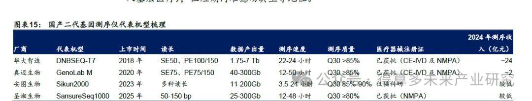 二代测序华大智造独占国产鳌头,四代测序国产百花齐放国产二代测序仪竞争格局:华大智造独占鳌头。当前国产二代测序仪市场呈现华大智造一家独大的垄断格局,其凭借技术生态和规模化装机量占据绝对优势,2024年测序业务营收有望达 24 亿元(国内市场份额近 50%),远超其他国产厂商。其核心产品 DNBSEQ-T7 以超高通量(24 小时产出 7Tb 数据)成为行业标杆,适配大人群全基因组测序、肿瘤大 Panel检测等科研和临床场景。其他厂商则聚焦分市场(如安图生物 Sikun 2000 以快速测序切入基层医疗),但短期内难撼动其主导地位。