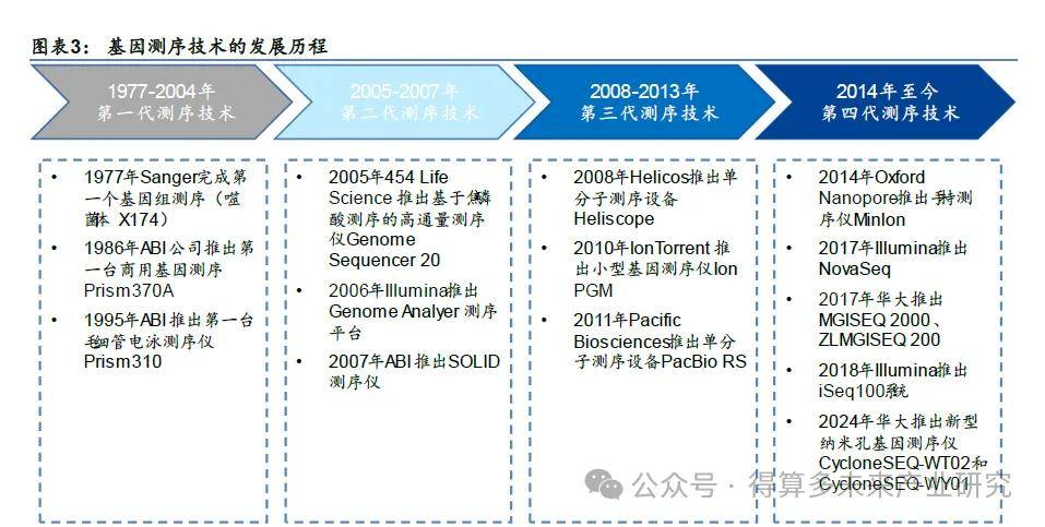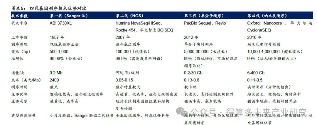 上游:技术迭代,壁垒森严,头部垄断对标:测序技术已经选代升级四代,二代和四代优势互补基因测序技术自 1977 年第一代 Sanger 法发展至今,经历了四代技术迭代。技术迭代推动测序成本断崖式下降并拓展至肿瘤早筛、遗传病诊断等临床场景。以华大智造为代表的国产设备厂商凭借自主可控的技术矩阵和差异化专利布局打破国际垄断,正在加速基因测序仪国产替代,跻身全球测序产业第一梯队。