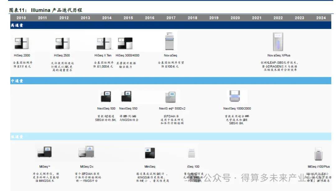 2)中通量平台:2014年推出NextSeg 5001550 采用双通道成像疵 ,平衡科研与临床场景灵活性与成本需求。2020年 NextSeg 2000 整合 DRAGEN 嵌入式生信芯片,实现“测序-分析”一体化;