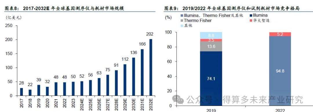 基因测序仪技术壁垒高,国产突破重构全球竞争格局。在基因测序技术迭代、基因测序成本下降的背景下,全球基因测序行业正处于蓬勃发展阶段,2032年市场规模有望达到202亿美元。基因测序仪作为生命科学领域的核心工具,技术壁垒极高,涉及机械、光学、生物化学等多学科交叉,且专利壁垒森严。目前,全球高通量测序设备及试剂耗材市场由umina 等主导,形成寡头垄断格局。以华大智造为首的国产厂商通过持续技术攻关,正在逐步打破垄断(2019 至 2022年,华大智造全球市占率从3.5%提升至5.2%)。