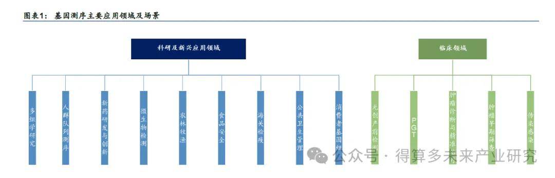 得益于其高通量、高准确度优势,基因测序下游应用持续拓展。基因测序又称为DNA 测序,指通过分子生物学技术分析特定 DNA 片段中碱基的排列情况,即腺嘌呤(A)、胸腺嘧啶(T)、胞嘧啶(C)与鸟嘌呤(G)的排列方式,以解析基因结构、功能及生物体作用机制,是分子诊断的重要技术。得益于其高通量、高准确性、高数据量等优势,基因测序已被广泛应用于科研服务、医学诊断、农业育种、法医鉴定等重要领域,如无创产前基因检测(NIPT)、肿瘤伴随诊断、传染病原体测序、辅助生殖遗传诊断(PGT)、肿瘤早筛、细胞治疗等,应用场景持续拓展。