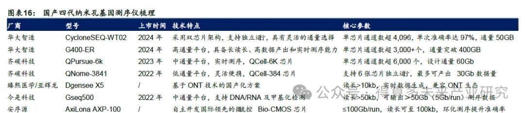国产四代纳米孔测序仪百花齐放,有望打破 ONT 垄断地位。Oxford Nanopore Technologies(ONT)自 2014年推出全球首款商用纳米孔测序仪 MinlON 以来,长期垄断该领域全球市场。近年来,以华大智造为代表的国产纳米孔测序技术正在通过超高通量和成本优势打破ONT 垄断,齐碳科技、臻熙医学等企业则以细分场景创新和实现突围。华大智造最新发布的 G400-ER 以全球最高单芯片通量(400Gb/芯片)、每分钟 100Mb 数据产出速率及 Mb级读长能力,填补国内高端纳米孔测序设备空白。齐碳科技的 QNome-3841 掌上测序仪支持样本随到随测,极速建库技术(10分钟完成)适配基层医疗与户外检测。