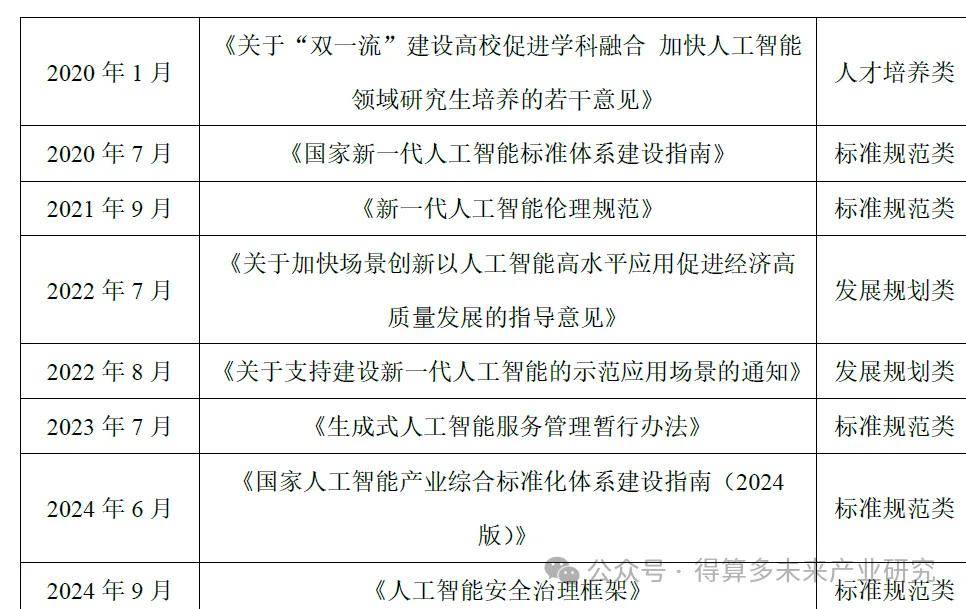 早在生成式人工智能问世以前,我国政府就已经高度重视相关领域,并出台一系列政策推动人工智能产业健康有序发展(见表 2)。从人才培养到技术创新,从税收优惠到知识产权保护,一系列政策的密集出台,为我国人工智能相关产业的发展提供了有力支持。整理自 2016年至今的人工智能领域相关政策可以发现,2016至 2020年,我国政府出台的人工智能相关政策以发展规划、人才培养为主要目的;而在 2020 年以后,尤其从 2023年至今,人工智能领域的政策逐渐侧重标准建设、行业规范,《生成式人工智能服务管理暂行办法》国家人工智能产业综合标准化体系建设指南》人工智能安全治理框架》陆续出台。人工智能政策制定方向的变化直接反映了产业发展不同阶段。在 2022年底 ChatGPT 问世以前,人工智能在我国产业界主要作为一项功能或技术,被应用到各行业的具体业务环节中;而 2022 年底 ChatGPT 问世之后,生成式人工智能开始作为一个独立产品的形式,在市场上大量涌现。以此为分界线,我国人工智能领域相关政策的制定也与时俱进,体现了动态调整的特点。