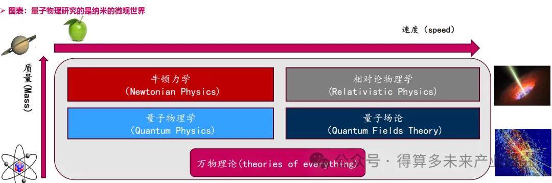 • 量子物理研究的是纳米世界:原子与亚原子粒子,以及电磁波与物质的相互作用。它不同于经典牛顿物理,后者在牛顿定律、麦克斯韦方程与统计物理(热力学)的框架下,可预测地描述从几微米以上到行星、恒星的宏观运动。当速度接近光速或质量极大时,相对论登场,以时空弯曲刻画引力,解释黑洞、中子星等极端现象,并为宇宙学提供关键线索。然而相对论并不只属于宇宙深处,它也潜伏在原子内部电子的运动中,催生出“相对论量子场论”。对于宏观世界的描述在微观的量子领域或并不符合。
