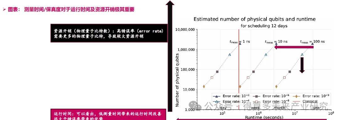 低测量时间大幅改善运行时间。研究表明,即使将误差率从10-3优化至 10~"仅能带来一个数量级的加速,而将测量时间从 100ns缩短至10ns则能直接线性降低总运行时间,这使得测量速度成为制约实际量子优势实现的主导因素。