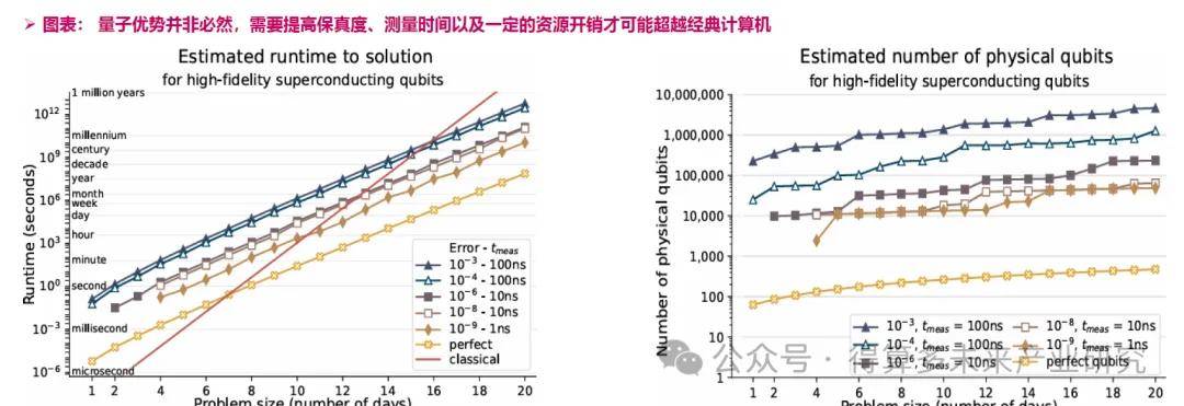 在常见的近端参数(物理误差约10-3~10-、读出约100ns)下,量子求解的时间随规模迅速升高,始终慢于经典计算机(图中红线);只有当保真度显著提升(物理误差10-8-10~只、并将测量时间缩短到10~1ns时),量子曲线才在中等规模处超越经典计算机。同时,为达到这一交叉点往往还需要105-10量级的物理比特,若保真度和读出时间达不到阈值,现实中的经典算法仍更具竞争力。