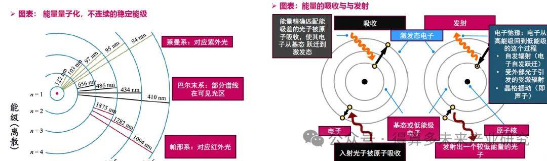 能量的吸收与与发射:当一个能量恰好等于能级差的光子被原子吸收,驱使电子从基态"跳跃"到激发态;不稳定的激发态电子通过"弛豫"过程回至低能级,并时发射出一个相应能量的光子。关键在于,电子无法存在于两个允许能级之间的任何能量状态,其跃迁是"全有或全无"的,不存在中间过程。
