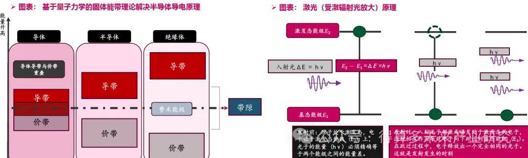 量子理论已成为现代科技的核心原理,包括固体能带理论、受激辐射光放大、电子显微镜、量子隧穿等。固体能带理论基于量子力学,布治赫定理指出电子的波函数具有和品格周期一样的周期分布,并且能级分布已经不再是单个原子中形成的能级,而是能带。半导体中的电子能量不是连续的,而是分布在分立的能带中。晶体中原子的价电子能级在量子力学作用下分裂形成价带,更高能量形成导带,两者之间存在电子无法驻留的能量范围,称为禁带或带阳(band 9aP)。半导体的导电特性正是由于价电子的能带正好处于导体和绝缘体之间,价带离导带较近,当外加电压或者光照射时,价电子能量升高,从价带进入导带,使其成为导体。这正是晶体管及LED的原理。激光(受激辐射光放大)依赖于光的粒子性(光子)和原子能级的量子特性。原子或分子被激发后,其电子处于高能态,若这时有一个频率匹配的光子经过,可以引(发电子跃迁到低能态,并释放出与入射光子完全相同的新光子,这一过程称为受激辐射(stimulatedemission)
